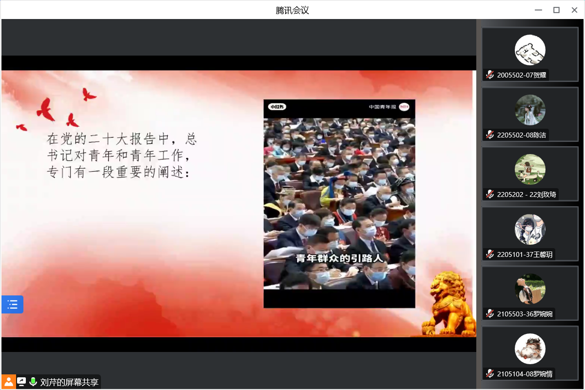 团课上,老师同学们一起重温了习近平总书记在党的二十大报告中关于青年工作的重要论述,论述文字精炼、内涵丰富、寓意深刻。刘老师就这段表述中所涵盖的的青年与时代的关系、青年工作的地位、青年思想引领的主要任务和内容、青年工作的方法论、对新时代青年的殷切期盼等方面进行了解读。
