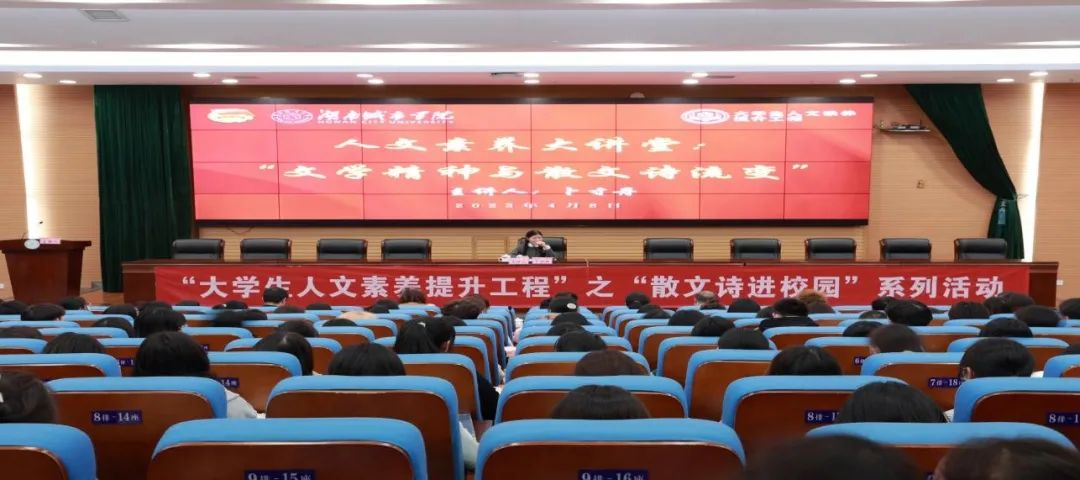 蔚蓝的时代,文学艺术的长河永恒流淌,文学精神历久弥新。为更好提高大学生文学素养,传承文学精神,我校于4月8日晚上7:30在图书馆报告厅举办了人文素养大讲堂之《文学精神与散文诗流变》,主讲人是中国诗歌学会理事、湖南省作家协会全委会委员、散文诗杂志社总编辑卜寸丹教授。益阳市人大常委会党组成员、副主任,益阳市总工会主席杨丽萍,益阳市人大常委会研究室、国学推广人徐亮亮,益阳师专、阅读推广人贾丽云,学校党委委员、副校长袁志成、团委书记王琦,0638太阳集团官网党委副书记王传浩,团委副书记李琳等出席。