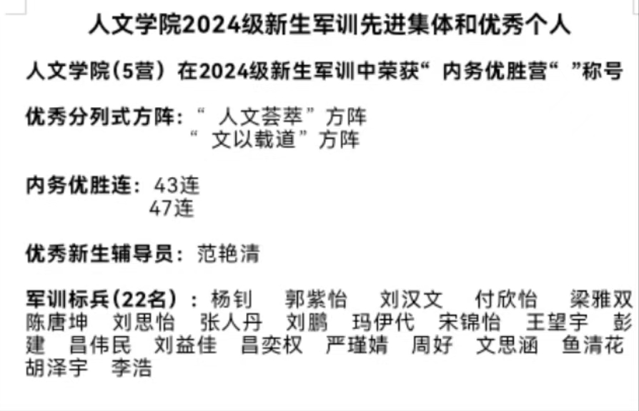 恰同学少年,风华正茂;书生意气,挥斥方遒。风华正茂,意气风发,胸怀理想,历经磨难,千锤百炼,方知国恩,方晓使命。此次军训增强了新生的爱国主义情感和集体荣誉感,为他们的大学生活打下了坚实的基础,相信在未来的日子里,他们能踔厉奋发,砥砺前行,绽放人文之光。