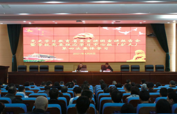 2021年4月8日下午,党史学习教育省委宣讲团宣讲报告会暨0638太阳集团官网党委理论学习中心组(扩大)第四次集体学习在图书馆报告厅举行,省委宣讲团成员、省委宣传部部务会成员、二级巡视员刘新年为大家作了一场精彩的宣讲报告。党委书记罗成翼主持报告会,学校全体校领导、副处以上干部、学生辅导员、党支部书记以及学生代表三百余人聆听了报告。