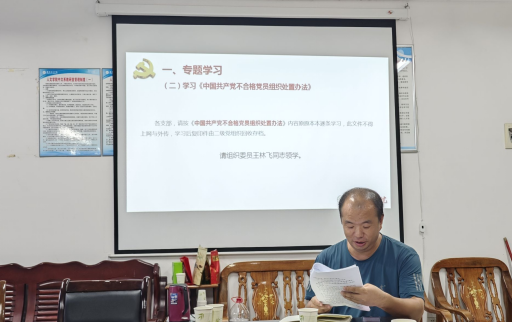 首先进行专题学习。由贾红同志领学《中国共产党第二十届中央委员会第三次全体会议公报》,组织委员王林飞同志领学《中国共产党不合格党员组织处置办法》,并组织支部党员结合学习内容开展讨论交流活动。