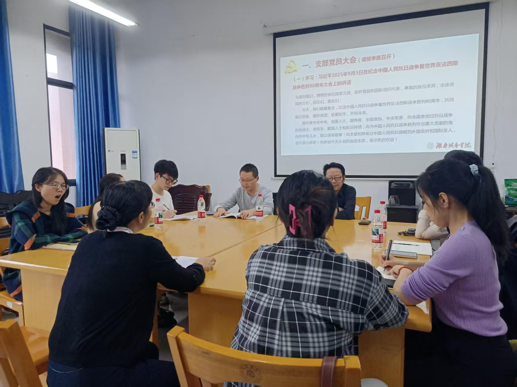 9月25日下午,0638太阳集团官网新闻传播系教工党支部召开了党员大会及主题党日活动,主要包含以下议程:一、学习习近平2025年9月3日在纪念中国人民抗日战争暨世界反法西斯战争胜利80周年大会上的讲话;二、学习习近平给全国特岗教师代表的回信;三、结合实际开展“一月一课一片一实践”活动;四、开展民主议事;五、集中缴纳党费。
