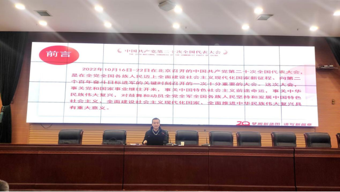 宣讲会上,雷存喜从六个方面对党的二十大精神作了深刻解读。首先,对大会主题和三个主要成果作了深入的阐释,他指出,大会主题明确我们党在新征程上举什么旗、走什么路、以什么样的精神状态、朝着什么样的目标继续前进。主要成果一是回顾了过去五年的工作和新时代十年的伟大变革,对推进“五位一体”总体布局、协调推进“四个全面”战略布局作了全面部署,二是审议通过了《中国共产党章程(修正案)》,三是选出了以习近平为核心的新一届中央领导集体。其次,新时代十年的伟大变革及其里程碑意义。对十八大以来的三件大事和十六个历史成就做了全面分析。第三,不断开辟马克思主义中国化时代化新境界,这是我们党坚定信仰信念、把握历史主动的根本所在。第四,把握新时代新征程中国共产党的历史使命任务,从现在起,中国共产党的中心任务就是团结带领全国各族人民全面建成社会主义现代化强国、实现第二个百年奋斗目标,以中国式现代化全面推进中华民族伟大复兴。第五,认真落实党的二十大提出的任务要求。第六,用新的伟大奋斗创造新的伟业。