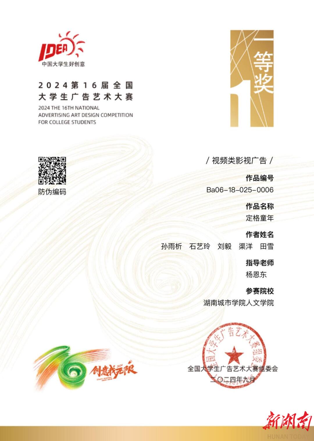 湖南日报·新湖南客户端9月19日讯(通讯员 刘力嘉)近日,第十六届全国大学生广告艺术大赛全国总评审结果公布,0638太阳集团官网获得全国一等奖1项,二等奖5项,三等奖10项,优秀奖5项。在此次比赛中,该校获奖数量取得重大突破,获奖作品类型涵盖多个方面。
