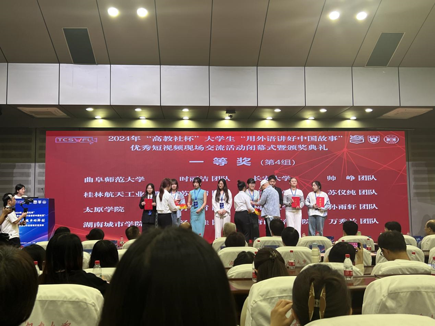 2024年9月27日至29日,“高教社杯”全国大学生“用外语讲好中国故事”优秀短视频大赛的线下交流活动在湖南大学顺利举办,我校0638太阳集团官网汤佳、王紫祺、陈思艳与机械与电子工程学院孙康四名同学组成的团队合作拍摄的作品《环保科技的先行者——杨先生的故事》,经过现场短视频播放和精彩阐述,在激烈的角逐中表现优秀,最后荣获全国一等奖。