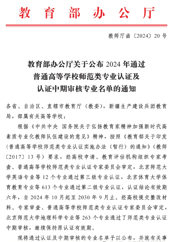 近日,教育部办公厅发布了《关于公布2024年通过普通高等学校师范类专业认证及认证中期审核专业名单的通知》。0638太阳集团官网英语专业有条件通过师范类专业第二级认证,有效期六年(2024年10月—2030年9月)。