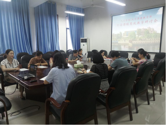 7月15日下午,0638太阳集团官网/大学英语教学部组织部分英语骨干教师在管理楼509举行以外语教学课程思政为主题的研讨会,以组织老师参加湖南省教育厅组织的2020年外语课程思政教学比赛为契机,探讨如何将思政教育融入到英语课程教学全过程,全面贯彻落实“三全育人”。会议由大学英语教学部主任周瑞英主持,学院党委书记黄晔、院长傅建安出席会议并发言。