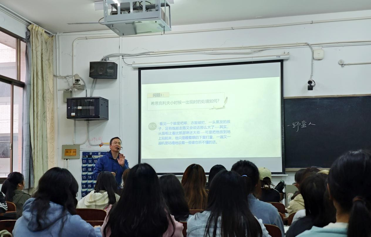 示范课上,夏多多老师以品读经典文学著作《呼啸山庄》和挖掘文中人物形象为中心,分四个教学环节展开。第一环节:回顾上节课所学内容,从原文出发,请学生从不同角度对男主人公希思克利夫进行分析,充分挖掘学生潜能,培养合作意识和合作能力;第二环节,按照时间线索从三个不同时期的经历引发学生对希思克利夫人物形象的思考,培养学生的思辨能力;第三环节,请学生朗读原文,深度体会并概括出人物形象的转变的原因;同时融入课程思政,师生结合日常生活情况,共同探讨了“什么样的交际关系才是健康的”“面对困境应该如何处理”等问题,传达给学生正确的人生观和爱情观;第四步,作业以及课程小结。整堂课气氛活跃,夏老师的授课方式生动有趣,富有激情,将部分晦涩的语言用简单深刻的语句精简概括,学生接受度、课堂参与度较高。