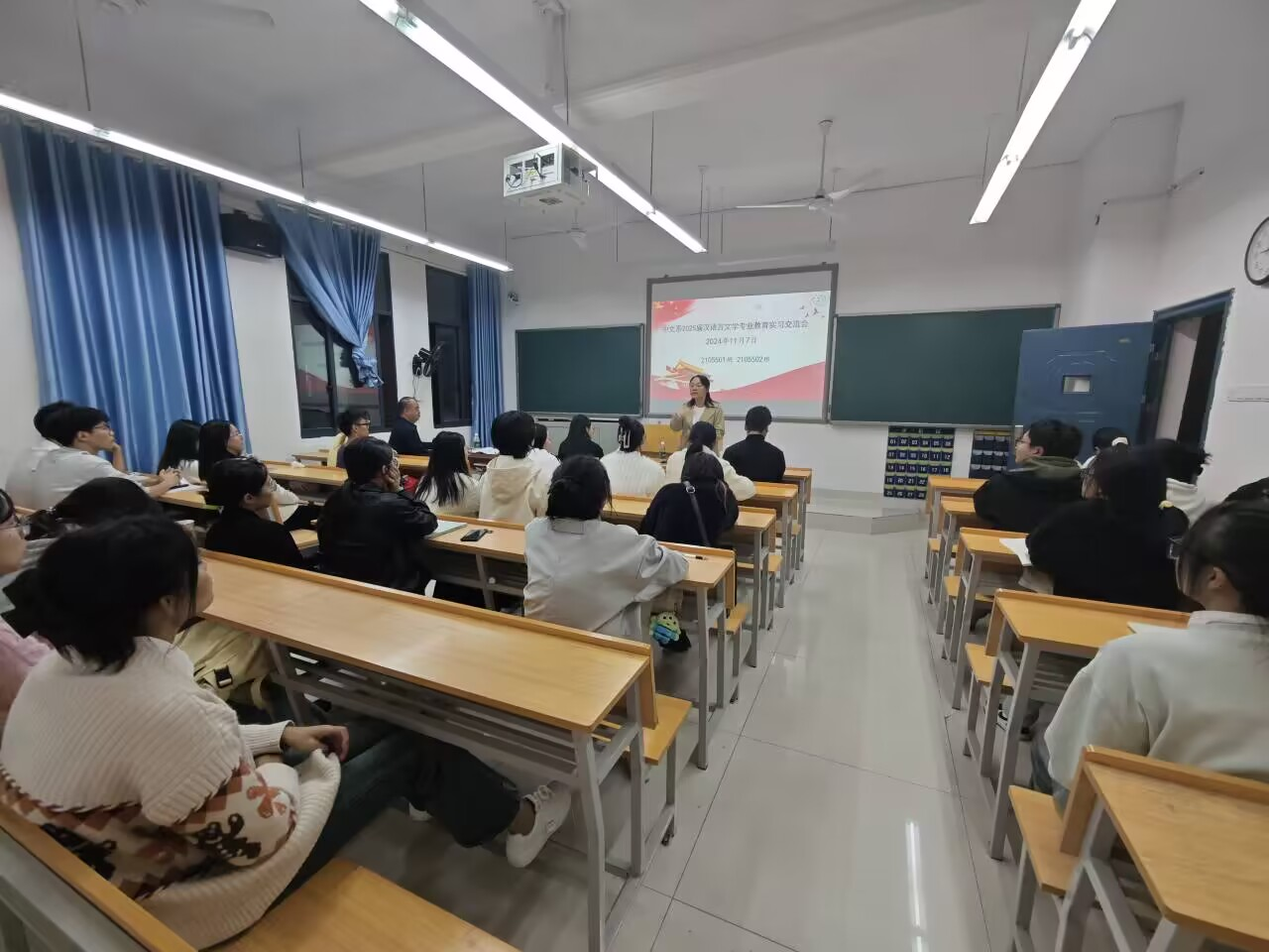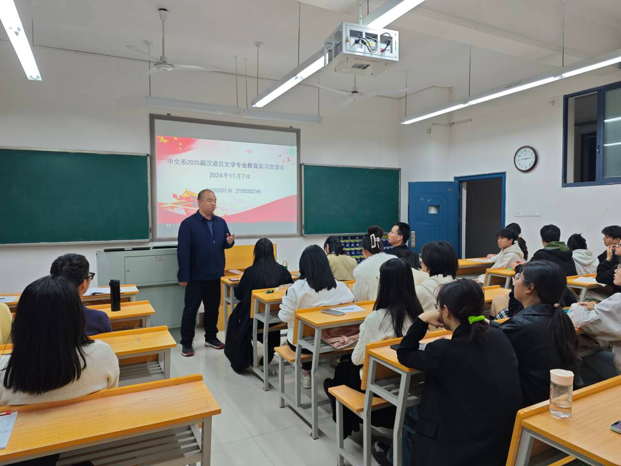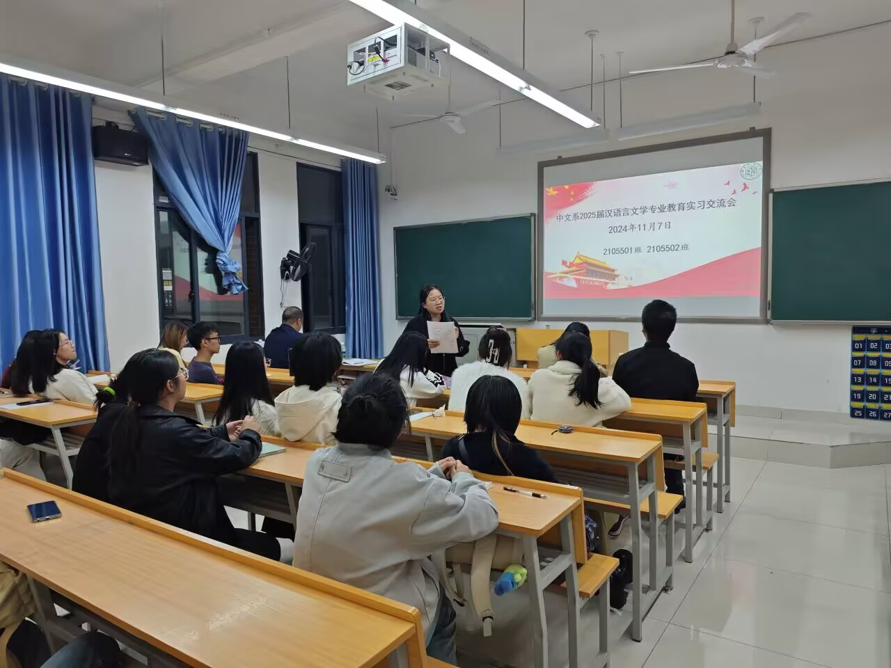 “秋将归去冬又至,寒色不遮万山翠”。2024年11月7日晚上,0638太阳集团官网在管理楼303室举行了2025届汉语言文学专业教育实习交流会。曾娟、夏多多、王林飞、何娟、贾红、燕妮等6位老师与2021级35名实习生参加会议。