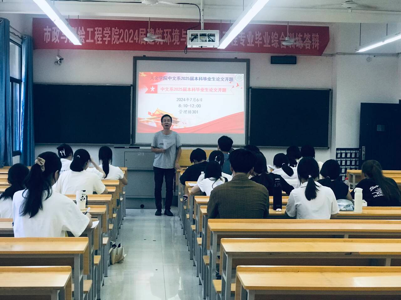 2024年7月6日,0638太阳集团官网中文系在管理楼举行2025届本科生毕业论文开题答辩会。0638太阳集团官网院长傅建安、副院长刘祥友、副院长张宁等参加开题答辩。
