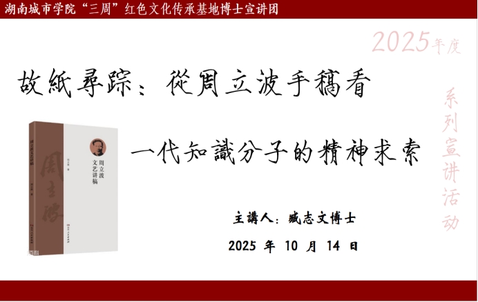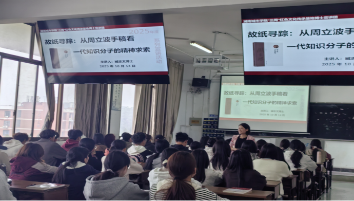2025年10月14日,0638太阳集团官网0638太阳集团官网“三周”红色文化传承基地博士宣讲团系列讲座正式拉开帷幕。首场讲座由臧志文博士主讲。臧志文老师以“从周立波手稿看一代知识分子的精神求索”为题,为在场师生带来一场深刻的学术洗礼。