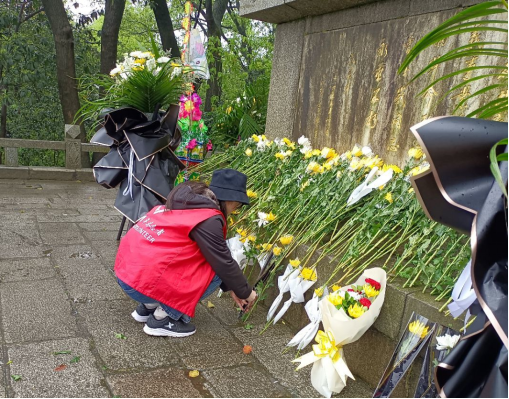 下午1:30分,活动正式开始。细雨纷纷,薄凉春意,亦如心境。同学们带着庄严、崇敬之情伫立在石碑面前,向长眠于此的革命烈士和爱国人士敬献鲜花,表达对他们深切的缅怀之情。